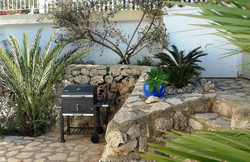 The villa's kitchen is well-equipped with an oven, dishwasher, 4 induction hot plates, and a microwave. There is also a bath/WC available. Outdoor spaces include a small terrace of 12 square meters, a roofed terrace of 20 square meters, and a large patio of 80 square meters. A portable barbecue is provided for your convenience. The villa offers a marvellous panoramic view of the sea and the countryside. Other amenities include a washing machine and free Wi-Fi internet access.