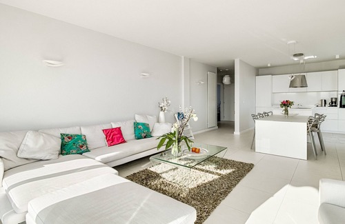 The apartment has two spacious bedrooms with comfortable double beds. The master bedroom is combined with a private bathroom, while the second bedroom has its own shower and sink.
