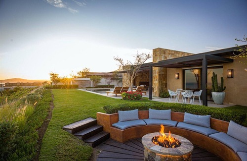 The outdoor area is a sun-soaked paradise, featuring a sparkling pool, Jacuzzi, built-in grill, outdoor fireplace, and a garden with a fire pit—all with breathtaking views of the Sea of Cortez. Additional outdoor highlights include an open-air courtyard, outdoor showers, and private massage gardens attached to some of the bedroom suites, ensuring a luxurious experience.