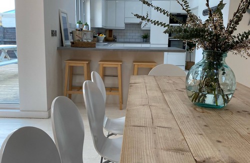 Two Tides is a stunning and very much loved beach house situated about 1 minutes walk from the famous sand dunes of Camber Sands beach and a perfect base to explore all that the local area has to offer. It is perfect for holidays with friends or family. Lovingly refurbished with 5 bedrooms it sleeps up to 12 plus a travel cot. We are more than happy to help plan your holiday and can tailor recommendations to your group. Two Tides has 3 bathrooms and a modern well appointed kitchen, open plan living and dining with a double height pitched ceiling which gives the cottage a great sense of space, it is a home away from home. It has a secure garden for the kids to play too and off street parking for 3 cars. Plus it is next door to our other house The Tides (property listing: 8129974) which sleeps up to 9. The layout of Two Tides is downstairs it has 2 bathrooms and 3 bedrooms, two are double bedrooms and one has two sets of bunk beds sleeping 4. Upstairs is a double room with a king size bed and a twin room both have access to a shared bathroom. The cottage is well stocked with books, games and DVD's. Our changeover day is a Friday but we will accommodate a different day if possible. We love the house and are sure you will too.