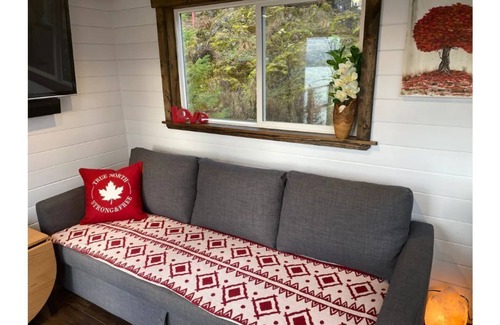 A beautiful tiny home situated on top of Copper Bluffs on Quadra Island. Come enjoy this custom build tiny house with beautiful French doors that walk onto a massive handcrafted deck overlooking Seymour Narrows and the straight. Comfortable seating inside and outside for your enjoyment, viewing and relaxation. Our property is just shy of two acres so please enjoy the nature and the bluffs safely. When you access the bluffs you can see from Willow Point Campbell River all the way down the Narrows