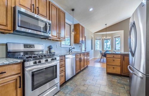 Granite countertops shine in the modern chef’s kitchen, which is equipped with a full suite of brand-new stainless steel appliances, including a five-burner gas range. Helpful gadgets and tools include a Chicago Cutlery knife set and a coffee grinder. When it’s time to eat, gather around the dining table. A breakfast bar provides additional seating for four.