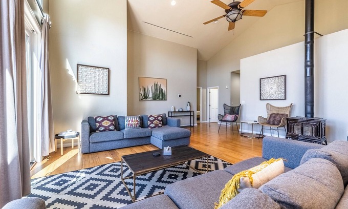 Curl up on two cozy sofas next to the wood-burning stove in the sunny living room. Two modern accent chairs provide additional seating.