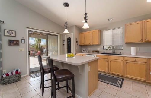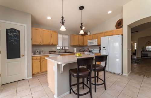 This stunning single story 4 bedroom, 2 bath home professionally designed with a contemporary, farm house style with heated pool($50/day upon request). This northwest Tucson home provides you with all the necessary amenities you need for a fabulous getaway including open concept kitchen and living area, free wifi, luxury bedding, sparkling pool overlooking the Catalina Mountains. Has a, washer/dryer and all the comforts of home. Fully furnished bedrooms with 1 king bed, 2 queen beds, and a twin over full bunk bed. Very convenient location to Foothills Mall, La Encantada, NW hospital, shopping, restaurants, movie theater, Omni National golfcourse and spa as well as other local golf properties, and easy access to 1-10. Backyard has covered patio, pool, open space with no homes directly behind and mountain views! This home has a cozy, laid back feel and is great for outdoor bbqs and family get togethers.