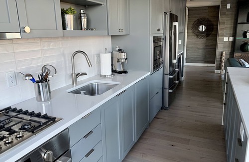 Quartz waterfall kitchen island is capacious. Well-stocked kitchen. Bosch appliances, including wine and beverage fridges. Whole Foods across the street.