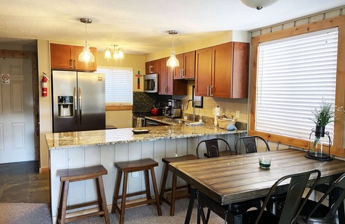 The updated fully equipped kitchen has everything you need to feel right at home. Cook your favorite meal and enjoy it together at the four-person dining table. Four bar stools pull up to the large granite countertop for additional seating.