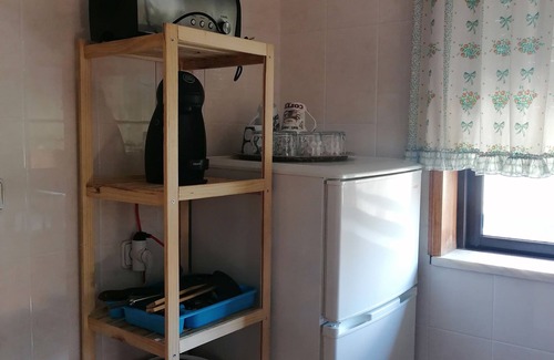 - In the kitchen there is a microwave, a refrigerator and a coffee machine, stove;