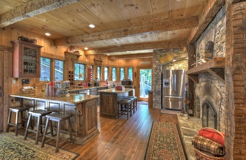 The main level offers two bedrooms, one with a king-size bed, the other with a queen-size bed. The floor plan is open and includes the great room with a cathedral ceiling, a double see-through fireplace, which serves both the great room as well as the brand new kitchen. The kitchen has two bar seatings as well as a cozy hunter themed dining area, creating a spacious area for guests to enjoy. On the upper level, the exquisite master suite features a king size bed, a wood fireplace, and a porch overlooking the patio below, as well as the mountain across. The rustic master bathroom has a jacuzzi, as well as a rainfall style, massage system in the rock mosaic shower stall. The other bedroom on the upper level has two double beds, and a private covered porch. On the third level, two spiral staircases lead to two separate attic dormers, each offering three bunkbeds, rustic decor, and magnificent views.