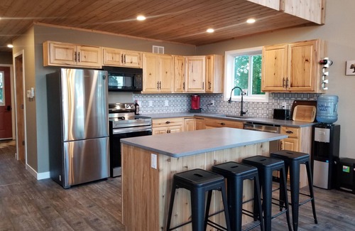 Two bedrooms (double/single bunk) (double bed) on the main floor along with a well-appointed bathroom with shower and tub for soaking. The kitchen has stainless steal appliances including dishwasher and island seating. The dining room brings stunning views of the lake with a farm table and seating for 6. Open concept allows for easy socializing, with a woodstove fireplace in the living room for cool nights.