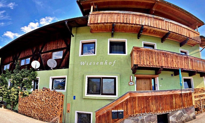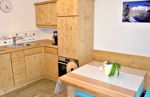 You will stay in the "Wiesenhof" 2-room apartment, which has a comfortable and cozy furnishing with an area of 45 sq.m. on the upper floor. The apartment has an entrance hall, a double bedroom with a dressing room, and another room with two beds. It also features a small kitchen with an oven, dishwasher, two ceramic glass hob hotplates, kettle, microwave, and an electric coffee machine, along with a dining nook and satellite TV (flat screen). There is an exit from the kitchen leading to the balcony.