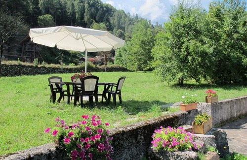 Calceranica Al Lago, Italy is a rustic terraced house "Casa al Mulino" situated at an altitude of 480 meters and surrounded by trees and meadows. The semi-detached, two-story property offers a private, natural-state yard of 340 square meters with a meadow and orchard, perfect for a relaxing vacation rental. It also features a storage room for bicycles and parking for two cars on the premises.