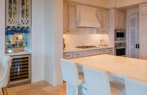 The living room hosts an extended white sectional sofa topped with blue throw pillows and paired with dual round armchairs. The living room also opens up to the dining area and kitchen where guests can make the most of serving up savory meals at a moment's notice. The kitchen includes earth-tone custom cabinetry filled with cookware that matches the sleek stone finish of the large center island perfectly. Stainless-steel appliances and spacious counters provide the ideal space to get creative with culinary endeavors during a stay.