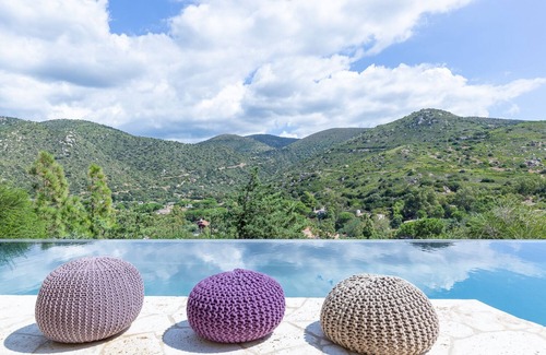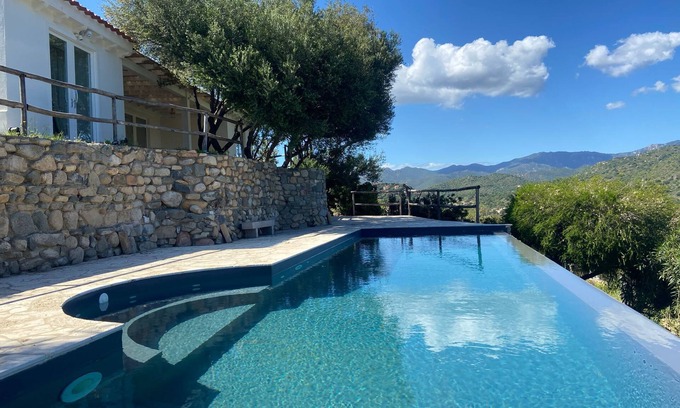 The villa is wonderfully located, built on a hill boasting breathtaking mountain views of Southern Sardinia, with a large newly built infinity, salt water pool with shallow area and hydromassage. Comfy sun beds, for sunbathing, and a sitting area surround the beautiful swimming pool.