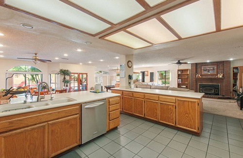 Birds of paradise, palms, tropical flora, and a bubbling terra cotta fountain frame your approach to the grand double door main entry below a arched transom window. A grand staircase to the upper floors elegantly greets you, as the traditionally decorated sitting room tempts you. Musicians will enjoy the baby grand piano, cello, and guitar, or simply the classical ambiance. The great room beyond combines TV room, kitchen dining, and game room into a spacious whole surrounded by natural light from the patio and ample windows. A massive leather sectional sofa puts you comfortably in front of a fireplace and massive LCD TV with karaoke player.
