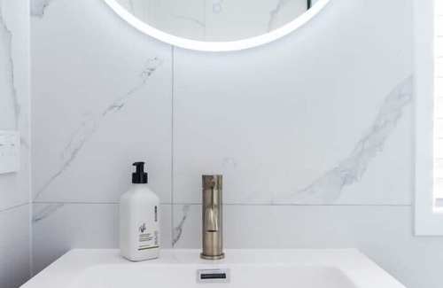 Our beautifully designed Calcutta Gold marble bench-top kitchen has everything you need. Fitted out with brand new appliances; coffee machine, induction cooktop, oven, cooking utensils, kettle, full fridge/freezer, toaster & microwave. All tea/coffee condiments (including coffee pods) are provided