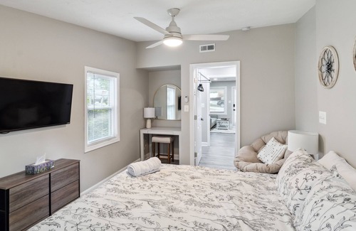 Fitted w/ many amenities inc its own deck, parking spaces, Keurig Machine, two Smart Tvs, fast wifi, soaps, shampoo/conditioners/bodywash, etc.