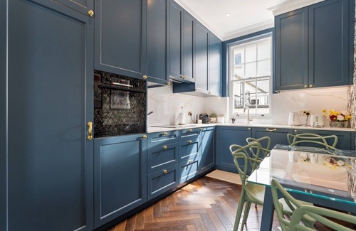 A sophisticated and highly functional kitchen featuring rich teal cabinetry, elegant brass fittings, and gleaming white surfaces. Bathed in natural light, with stunning parquet flooring, it's a perfect blend of modern style and classic charm.