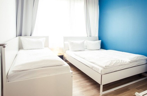 The four bedrooms are also given a fresh shade. In addition to two rooms with a double bed each, there is a double bed and a single bed in the third room and a double bed and three single beds in the fourth. One of two sofas in the living area also works as a bed.
