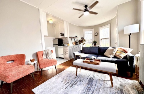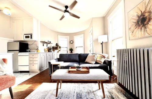 Comfortable furniture, well thought out kitchen and bathroom and the cozy queen size Dreamcloud mattress in the private bedroom will have you feeling at home in no time. Original hardwood flooring, curved walls, original trim work and a peaceful view of the Park located across the street. Fast WIFI, a nice desk and plenty of storage for personal items tops off this home away from home. We have thought of everything so you don't have to! 3 minutes to Wesleyan university and Carle Hospital. 5 minutes to ISU. 5 Minutes to Castle Theatre. 12 Minutes to Rivian. Owner managed with care and detail.
