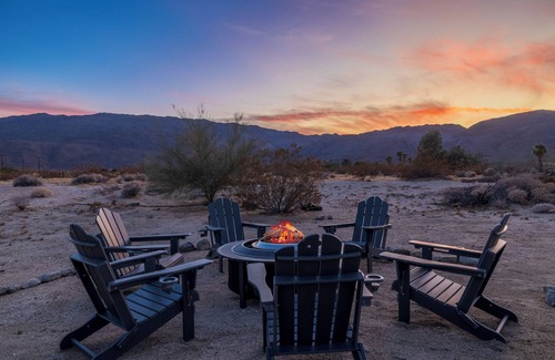 Indulge in the ultimate oasis retreat at our expansive outdoor space perfect for taking in panoramic mountain views. Enjoy the tranquil desert landscape from the covered backyard patio while relaxing on the comfortable outdoor seats and side tables. As evening falls, gather around the smokeless fire pit to toast marshmallows and share stories under the starlit sky, all while savoring delicious grilled delights from the barbecue grill. As the fire slowly fizzles out, lean back in the reclining Adirondack chairs and stare up at the mesmerizing stars and see how many satellites you can spot throughout the evening! Please note that you'll need to bring your own wood for the smokeless fire pit.