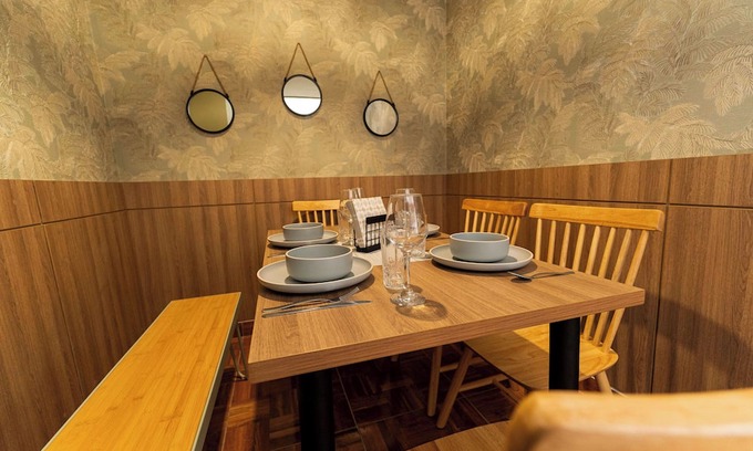 The dining area, cozy and intimate, seats up to six people, providing a functional and inviting space to enjoy meals together.