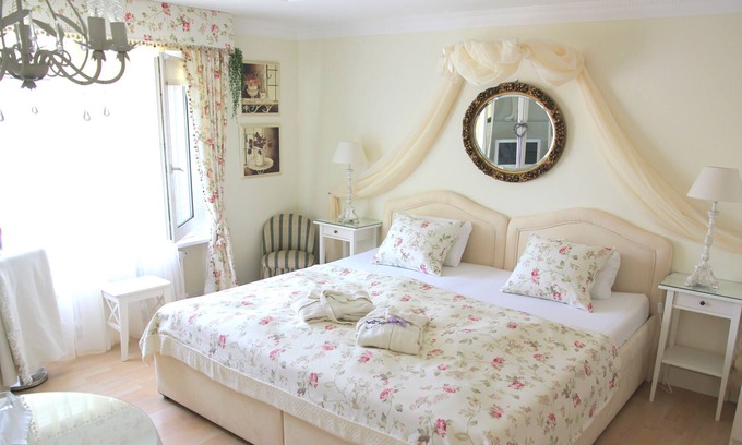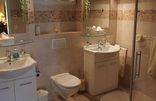 In our romantic country house in a very quiet location, we rent a holiday apartment for guests who appreciate a beautiful ambience. We live in the same house only one floor up, but with a separate entrance. The lovingly designed garden offers pure relaxation. The bright and tastefully furnished rooms, all with views of the garden, invite you to linger. In each bedroom there is TV, WIFi in all areas, 2 large bathrooms one of them with bathtub, - 2 toilets Infrared sauna, fully equipped open kitchen with coffee machine, microwave, dishwasher, oven and breakfast bar. Living room with dining area and comfortable sofa bed, TV,