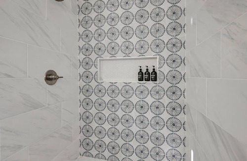 It's a gorgeously updated kitchen, with all stainless steel appliances and plenty of counter space. an oversized island, and sleek countertops. You’ll find all the cooking basics here, including all pots and pans, silverware, a blender, a coffee maker, a fully stocked seasoning rack and more!