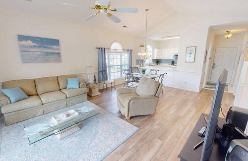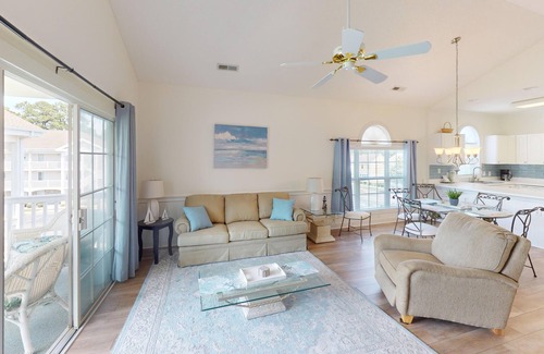Discover the perfect blend of comfort, style, and convenience! This beautiful 2-bedroom, 2-bathroom, third floor vaulted ceiling villa at Myrtlewood, accommodates up to 6 guests and features contemporary furnishings, a fully-equipped kitchen for convenient in-unit cooking, washer/dryer combo, and private balcony where you can enjoy the views of the pool, fairway, and even catch an evening sunset! This bright, open floor plan with comfortable living space, includes multiple televisions and complimentary WiFi Internet access throughout your stay. Take advantage of the resort amenities, including outdoor pools, an indoor pool complex featuring a kiddie pool, lazy river, and hot tub, a fitness center, shuffleboard, basketball courts, volleyball courts, and much more! Located on two championship golf courses and just a mile from the ocean, your beach/golf getaway is closer than you realize when you reserve a stay in this two bedroom condo at Myrtlewood Villas Resort.