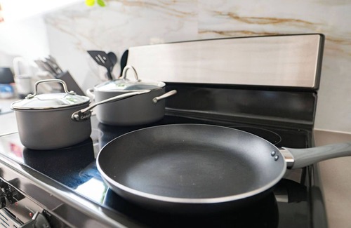 -A fully stocked kitchen: pots, pans, blender, air fryer, and coffee bar