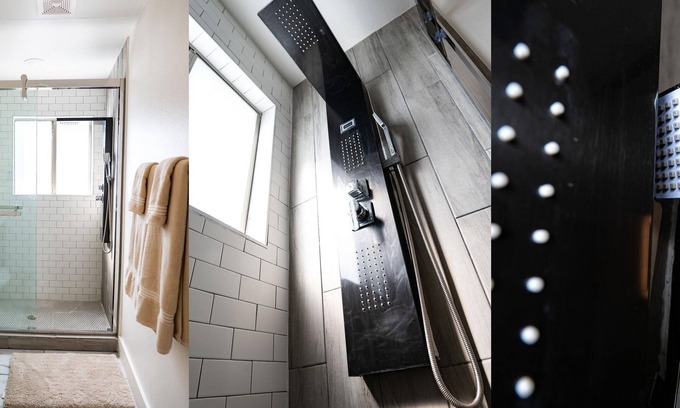 -Modern bathroom with rainfall shower, soap dispensers, and fresh towels