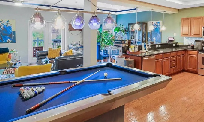 The Billiards Area Features a beautiful California House 7ft billiards table. Enjoy a night of playing billiards, chess, or cards at the custom built bar.