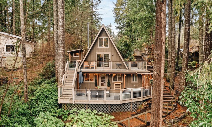 Revitalize your mind and body at our retro 1970s A-frame cabin nestled in the trees on the shore of Lake Minterwood. Unwind in this unique and stylish amenity-rich retreat with a sauna, hot tub and cold plunge experience, as you watch the vibrant wildlife awaken around you. For an adventurous twist, grab a kayak or paddle board and explore the tranquil waters of this Gig Harbor lake. After a day of fun, relax next to the lakeside fire with a warm drink and roast marshmallows or enjoy a card game in the cozy gathering areas inside. This multi level nature of this cabin makes it easy to enjoy time with friends or family in multiple gathering spaces and various sleeping arrangements.