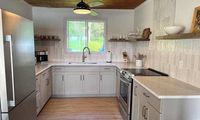 Spend your days kayaking (2 provided), swimming, or sunbathing on your private dock. Evenings are perfect for campfires under the stars (fire pit provided, subject to fire bans) or friendly games of cornhole, washers, or board games with the family.