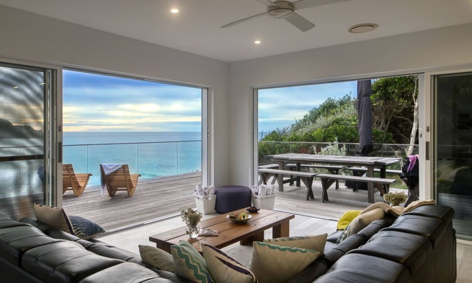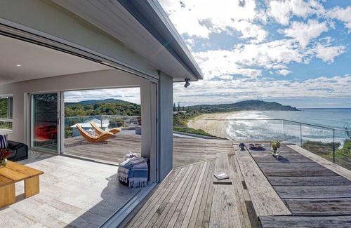 True North Boomerang Beach is a 5-bedroom beach house with stunning 180-degree sea views. Just steps from the beach, this recently refurbished home is perfect for a relaxing getaway with friends or family.
