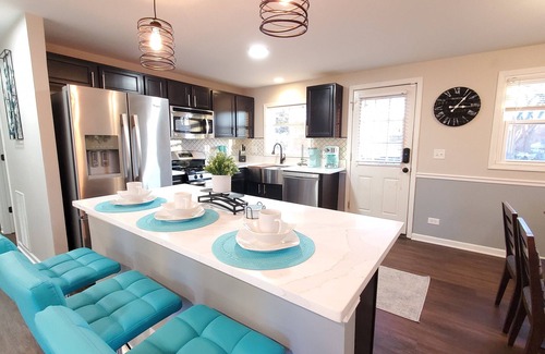 Stylish Modern Spacious Two Level House, 4 Bedroom 2 Full Bathrooms, on a quiet street in Schaumburg. Great Location. Sleeps 8 people. Enjoy family time at this peaceful and renovated stylish space. The house is equipped with new kitchenware, Stainless appliances, smart TVs and fast internet. Open kitchen with a breakfast bar. 7 miles to Schaumburg Convention Center, 18 miles to O'Hare Airport, 6 miles to Woodfield Mall. Enjoy restaurants, parks, golf courses, Legoland, Medieval Times and much more. Garage is not available for guests' use. The house has stairs.