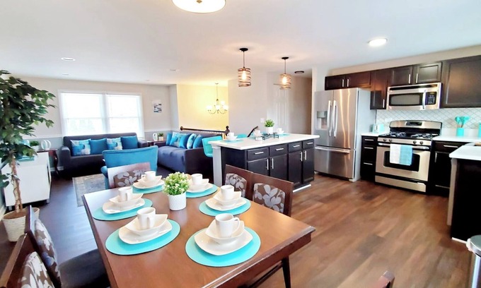Upper level: Big Living Room with Smart TV, Fireplace to cozy up with Family. Modern Open Eat-in Kitchen with Custom cabinets, Stainless Appliances, White Quartz Countertops, Breakfast Island & dining table. Master Bedroom King bed & TV. Modern Tub Bath with big vanity. 2nd Bedroom-Queen bed &TV