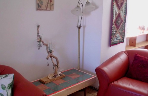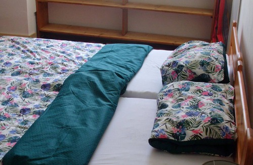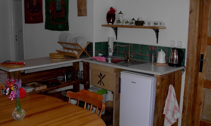 This spacious open plan ground first floor apartment has its own private entrance with a 4 square metre balcony terrace that overlooks the spectacular sunsets that can be experience here in Bohemia. The apartment is over 40 sq mts, newly renovated and decorated, it is fitted out with very stylish hand made rustic wood furniture, up-cycled items as well as modern fixtures, fittings and appliances. The stone walls are almost half a metre thick which keeps the whole space pleasantly cool even when the outside summer temperature exceeds 30C and keeps it equally warm in the cooler months when the heating is on. There is a large dining table and chairs with a window view, equipped kitchen area, storage cupboards/shelves and a shower room with wc, wash basin and shower. There is a king size bed and also a separate bedroom [6 sq mts]with a single bed or we can install a bunk bed to sleep two persons. An extra single bed can be provided for the main area if needed. The very large gardens have separate areas to provide different relaxation and activity space. In the garden there is a bbq, wood fired oven for making pizzas or baking, a fireplace and guests can also make a wood fire in the evenings for grilling sausages or enjoying the evening atmosphere. The gardens are ideal for children, there is a large lawn for playing games, such as petang, bowls, archery, blow pipes and also a sand pit, paddling pool, etc which are all provided, plus a high zip line, climbing wall with safety harness, bungy running and trees to climb for older kids. Immediately behind the house is a kids playground and tennis court and marked walking trails through the forest and meadows.