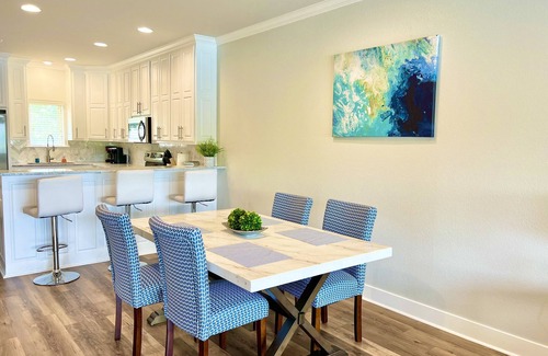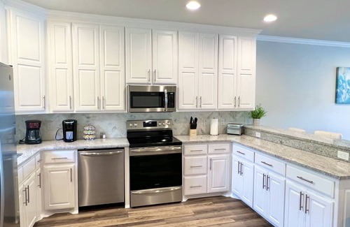 Enjoy our fully stocked kitchen featuring all the utensils and cookware you would need to channel your inner chef during your stay. The kitchen contains both a traditional coffee maker as well as a Keurig coffee maker. The dining room table will comfortably seat 4 people, along with additional seating at the kitchen bar area. Take care of all your laundry with our washer/dryer, along with detergent, dryer sheets, etc. There is also an iron, ironing board, and luggage racks in the walk-in master closet for your convenience.