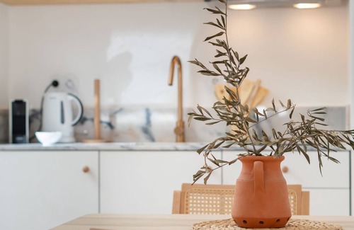 Find your oasis in this thoughtfully curated T1 apartment in Vila do Bispo, designed to reflect a slower, more mindful way of living. The apartment’s minimalist aesthetic features warm terracotta floors, natural wood cabinetry, and artisanal decor, creating a peaceful and welcoming space. The open-concept living and dining area is filled with natural light and decorated with soothing, neutral tones, making it an ideal spot to unwind with a book or share a cozy meal.