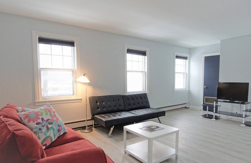 Our freshly remodeled large 2 bedroom unit features new stainless steel appliances, a separate dining area, very spacious living room and a modern kitchen with grey shaker cabinets and quartz countertops perfect for meal prep.