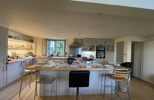 The light, airy kitchen/dining/ reception room is fully equipped to host elegant dinner parties or enjoy casual meals at home. The kitchen island seats 8, there are two cream leather sofas and an armchair as well as a coffee table. There are two refrigerators as well as a gas hob, electric oven, dishwasher and microwave.