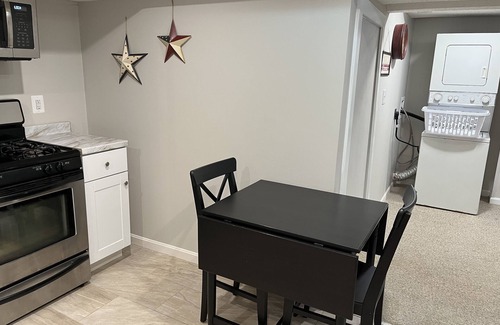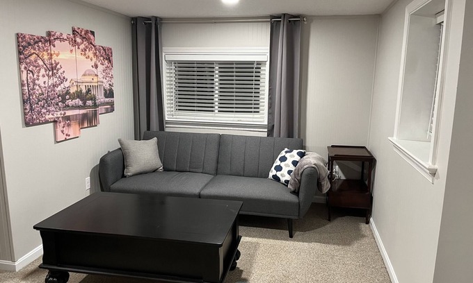 Fully furnished suburban apartment perfect for a traveling professional. Quiet neighborhood, complete kitchen, large bathroom, separate bedroom, separate living room, and a washer and dryer. Make yourself at home!