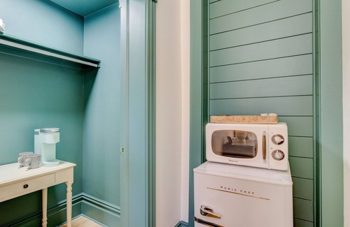 Darling Suite 8 has green and gold accents, 10-foot ceilings, and gorgeous light. Suite 8 is the only suite that allows pets (with an additional cleaning fee).