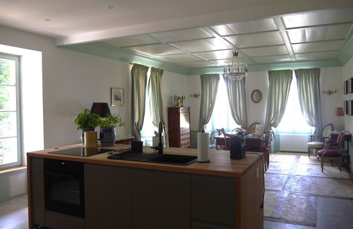 Inside, a spacious kitchen awaits you, which, with its openness, serves both for preparing meals and as the communicative centre of the flat. It is equipped with a four-ring ceramic hob, a capsule coffee machine and a dishwasher, making self-catering a pleasure. The kitchen opens onto a spacious dining room, faithfully designed in the Louis XVI style and offering an intimate atmosphere for meals, whether home-cooked or prepared by the chef. The interior is complemented by a separate bathroom with shower, a WC and a buanderie with washing machine for the exclusive use of the guest.