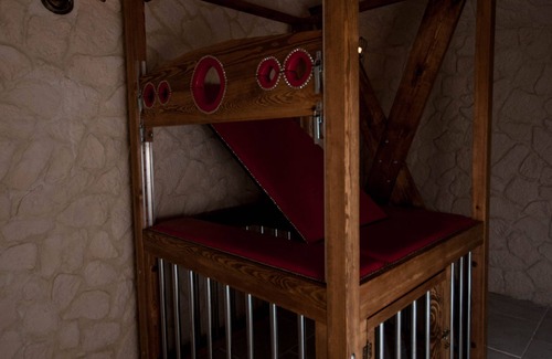 In the basement for more discerning or simply curious couples you will find in a vaulted cellar in exposed stone with studied darkness, a magnificent piece of furniture dedicated to more extreme pleasure and, right next to it, whips and chains. Welcome to a sadomasochistic dungeon.