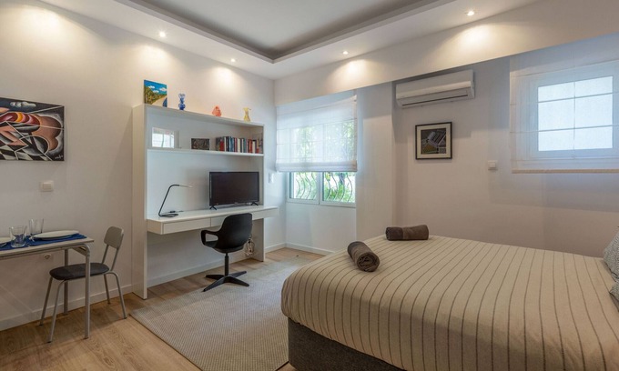 Newly renovated, brand new, small apartment in Athens ideal for short and longer term stays. The Athens metro station (Megaron) is about 5 minutes walk.The apartment’s windows give to a quiet interior court, bordering a narrow pedestrian street full of plants. The apartment has in total 32 square meters and comprises of a living and sleeping area, with a double bed, an office desk, and a dining table for two. It has a fully equipped kitchen. The bathroom/shower room has a washing machine. Nestled in the picturesque neighborhood of Ilisia, our studiooffers not only a magnificent place to stay but also the perfect gateway to an enchanting area in Athens. Prepare to be captivated by the allure of this vibrant neighborhood, where charming streets are adorned with beautiful houses, exuding an air of elegance and sophistication.