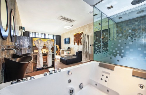 Suite con bañera hidromasaje y piscina climatizada exterior