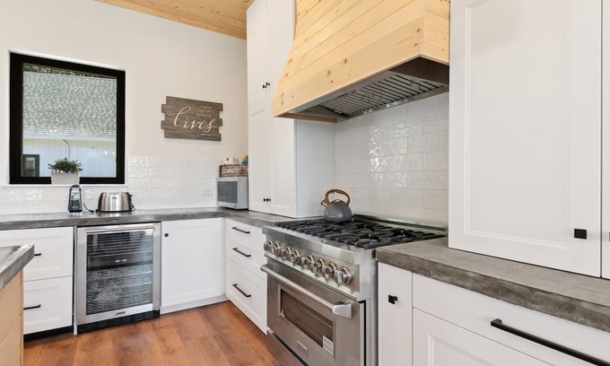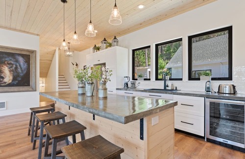 Upon entering this 3-story home, an open great room welcomes guests to the main floor. Accentuated with natural light, large picture windows set the pinewood ceilings aglow. Continuing into the gourmet kitchen with rustic concrete countertops and high-end appliances, culinary connoisseurs will appreciate the wine cooler being near the stove for cooking. Perfect for socializing, the traditional dining table seats 6, while the gorgeous island seats 4 more. The living area lends itself to relaxation and entertainment with a large 65" TV and plush furniture. French doors lead out to a stunning wraparound deck with fresh mountain air and evergreen views. The main-floor bedroom, with its queen bed and private bathroom, is perfect for guests who prefer not to use stairs.