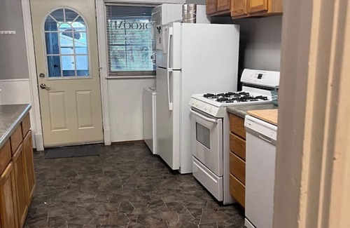 Cozy 3 bed 1 bath traditional home! Enjoy the charm of older architecture in this beautiful home. The home features a Large beautiful staircase with a stained glass window facing. Plenty of space for 1 up to 6 for families and those traveling with fur babies. Up to 2 dogs allowed under 50 pounds. 3 bedrooms on 2nd level with 1 full bathroom. Main level features full kitchen with stackable laundry, separate dining room and livingroom.