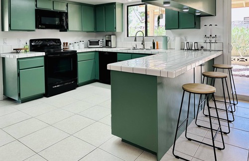 The pool and outdoor area are spacious and well equipped. We have a full-size grill for you to cook delicious meals, Two Tv’s and soundbar, patio furniture and lounge chairs perfect for tanning. Inside the home we have a full kitchen, with everything you might need. Full-size fridge, dishwasher, stove, toaster oven, coffee maker and more. Spacious dining room for those days and nights when you want to stay in and cook.